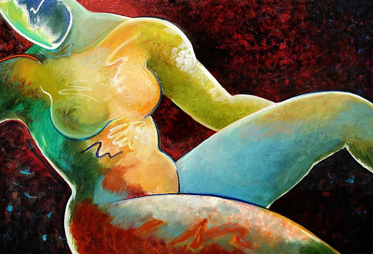 I never plan every detail of a painting. To do so would kill its spirit for me. There has to be Trust in spontaneous revelation, knowing that in the end it will all make sense. When I’m in the flow, the sense of direction is clear and I go for it without restraint, creating rhythmic strokes of light and color on canvas… Followed by moments of meditative stillness, trance-like, until I perceive the next phase. I have a fascination with the freshness of a spontaneous line, vibrant color and the mindful attention of space in balance. And so it is the reflection of pinnacles in my life.”